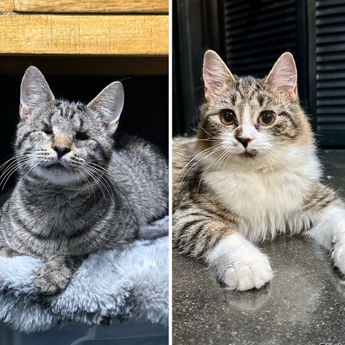 These gorgeous sisters arrived in the cat lounge on January 9 and they are a truly special pair! Sharpay, a brown tabby, and Gabriella, a white and gray medium-hair tabby, are as sweet as they are beautiful.